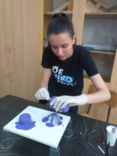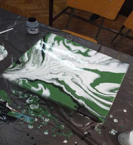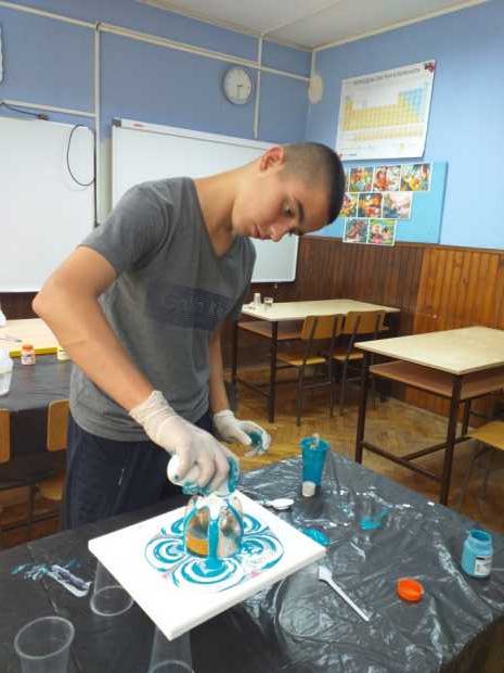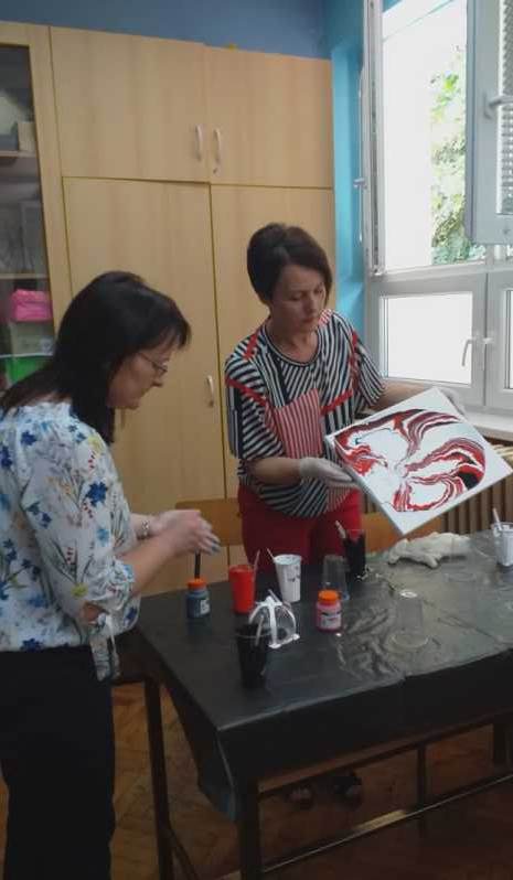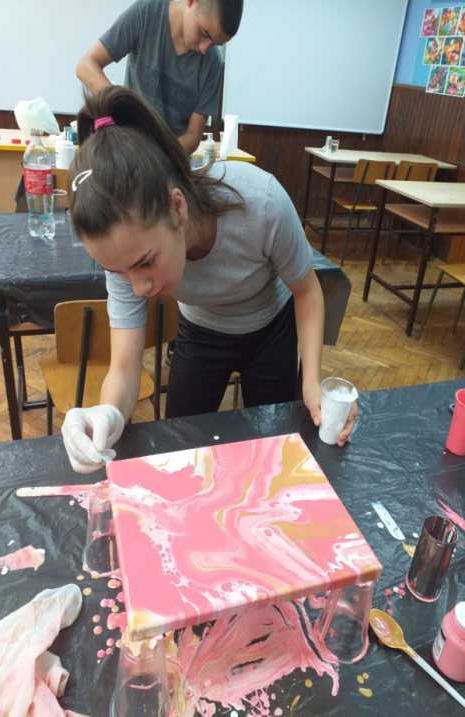 Слике су неизоставни украс сваког дома. Оне оплемењују простор и дају му посебан печат. У оквиру активности Креативно домаћинство, одржана је радионица под називом Течно сликарство – Fluidart. Посебан гост , као и учесник радионице, била је директорка Љубица Грубач. Стручну помоћ је пружила наставница ликовне културе Јадранка Антоловић. На почетку су учесници радионице упознати са материјалом који се користи за израду слика, различитим техникама сликања као и начином мешања боја, како би радови које насликају били успешно урађени, како са техничке тако и са естетске стране. Сви учесници су радили на платну као подлози. Изабрали су боје по свом укусу и кренули са радом. Владала је стваралачка атмосфера и нестрпљење да се угледа резултат стварања. Сви радови су занимљиви и оригинални. Учесници радионице су били задовољни када су видели своја уметничка дела. Изашли су са радионице богатији за једно ново искуство.